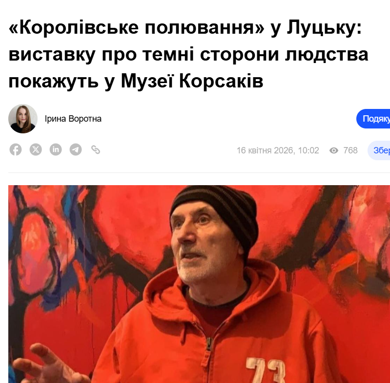 24 квітня о 17:00 лучан і гостей міста запрошують на відкриття виставки «Королівське полювання» відомого художника Костя Борисюка, повідомляє Район.Луцьк.