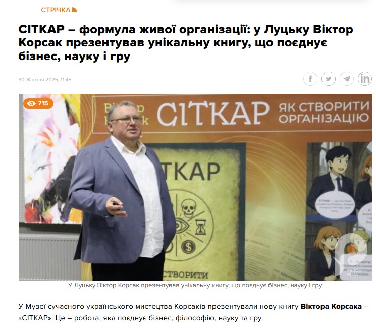 У Музеї сучасного українського мистецтва Корсаків презентували нову книгу Віктора Корсака – «СІТКАР». Це – робота, яка поєднує бізнес, філософію, науку та гру.