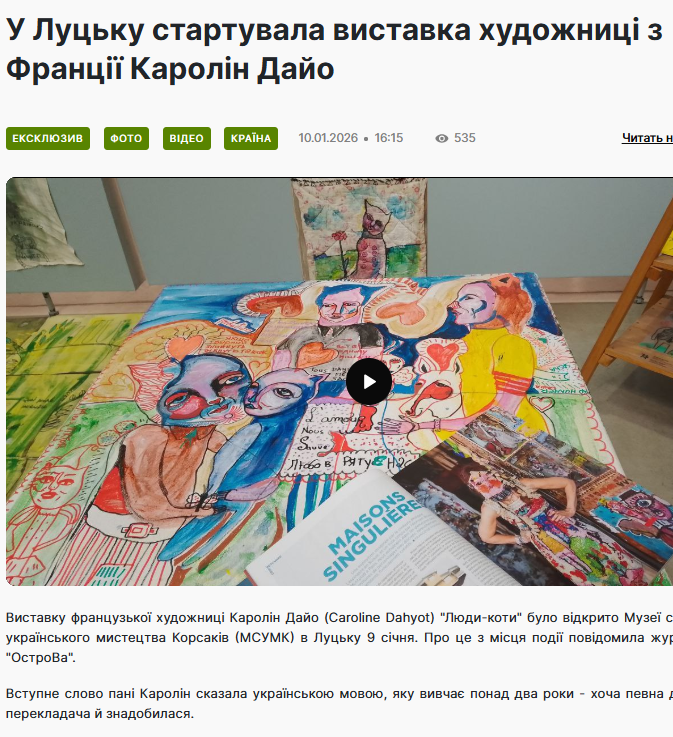 Виставку французької художниці Каролін Дайо (Caroline Dahyot) “Люди-коти” було відкрито Музеї сучасного українського мистецтва Корсаків (МСУМК) в Луцьку 9 січня. Про це з місця події повідомила журналістка “ОстроВа”.